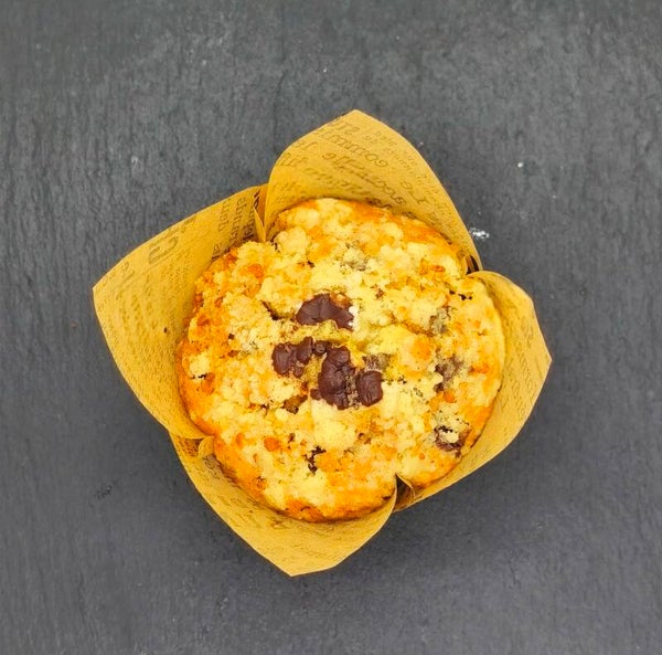 Un muffin fondant avec des pépites chocolat noir, du pralin pour une note croquante et gourmande. Le tout est sublimé par une fine couche de crumble doré qui apporte une touche croustillante à chaque bouchée.